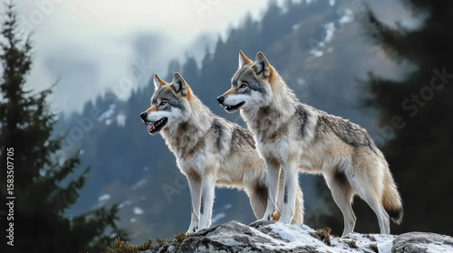 © rattana, Obraz premium Timber wolf hunting in mountain