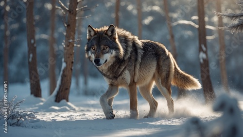 Naklejka premium Timber wolf in a bright, snowy winter forest. Wildlife.