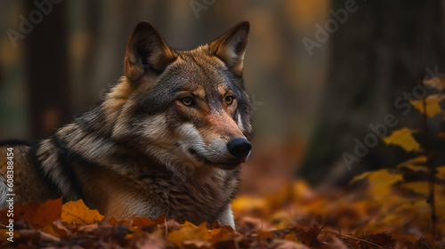© EwaStudio, Fototapeta premium Timber Wolf in the Forest. AI Generated