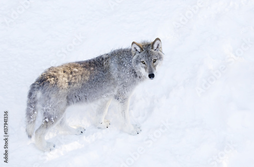 © Jim Cumming, Naklejka premium Timber wolf or Grey Wolf (Canis lupus) isolated on white background walking in the winter snow in Canada