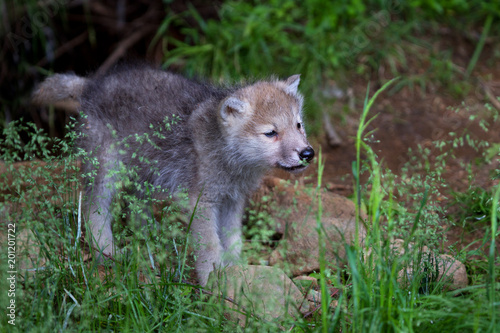© Jim Cumming, Naklejka premium Timber wolf or Grey Wolf pup smelling grass