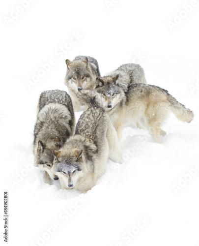 © Jim Cumming, Naklejka premium Timber wolves or Grey Wolf (Canis lupus) isolated on a white background playing in the winter snow