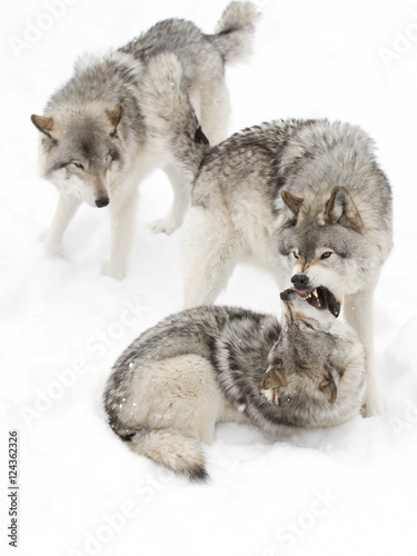 © Jim Cumming, Naklejka premium Timber wolves or Grey Wolf (Canis lupus) pack isolated on white background playing in the winter snow in Canada