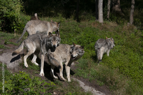 Fototapeta premium Timber wolves or grey wolves (Canis lupus) playing on rocky cliff in summer in Canada
