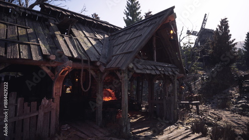 Fototapeta premium Timbered forge glowing with ember light, anvil and bellows visible through...