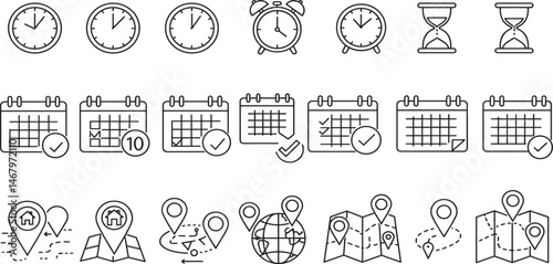 Obraz premium Time, date and address concept editable stroke outline icons set isolated on...