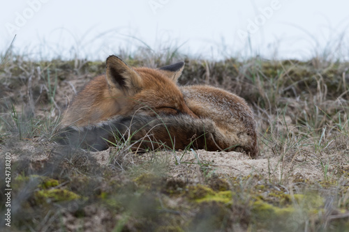 Obraz premium Time for a nap! This fox lay down to take a nap. Sleeping fox in the dunes of the Netherlands.