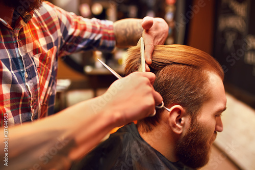 Fototapeta premium Time for a new hairdo. Handsome young bearded man came to the barber for a haircut. hipster style. the concept of fashion and beauty.