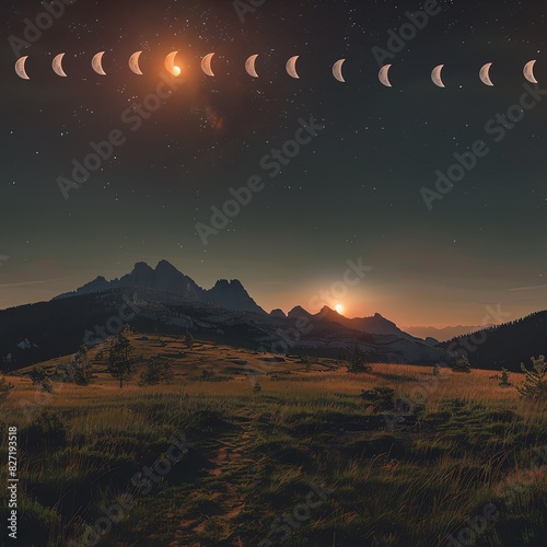 © Samaphon, Naklejka premium Time-lapse photography of serene moon phases over a mountain landscape, showing the passage of time and the moon's tranquil influence