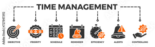 Naklejka premium Time management banner web icon vector illustration concept with icon of objective, priority, schedule, reminder, efficiency, alerts, and controlling