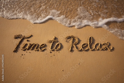 © qweqw, Fototapeta premium "Time to Relax" beach message in golden sand with gentle waves for wellness tourism campaigns and mindfulness app interfaces.