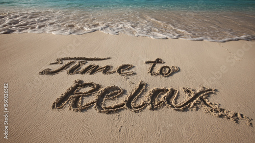 Fototapeta premium "Time to relax" inscribed in sand on a peaceful beach