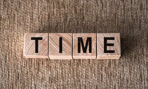 © Nastassia, Fototapeta premium TIME - word written on wooden blocks on a brown background.