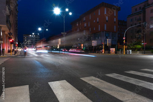 © OlgaLitvinovaFoto, Fototapeta premium Timelapse view of traffic at an urban night intersection. Urban movement in the Italian city in the evening.