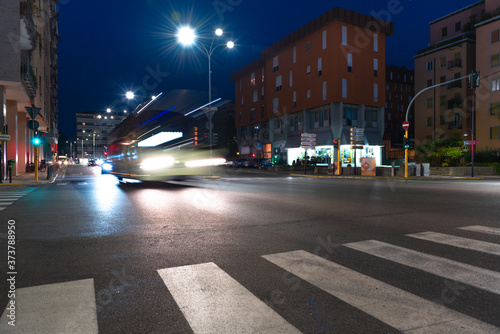 © OlgaLitvinovaFoto, Fototapeta premium Timelapse view of traffic at an urban night intersection. Urban movement in the Italian city in the evening.