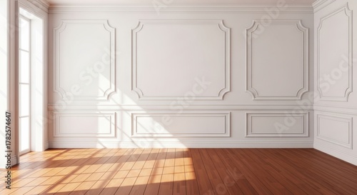 © Attiya, Fototapeta premium Timeless Elegance: Empty Room with Classic Wall Paneling and Sunlight on Hardwood Floors