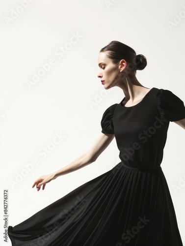 © tantawat, Fototapeta premium Timeless Elegance - Fashion model in a classic black dress against white background with copy space.