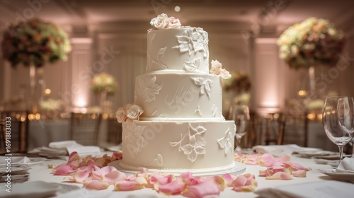 Fototapeta premium Timeless three-tiered wedding cake design, smooth fondant with floral patterns, scattered rose petals on table setting