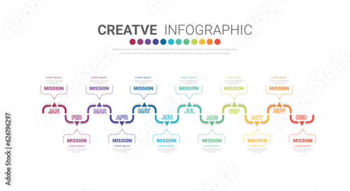 © auchara, Naklejka premium Timeline presentation for 12 months, 1 year, Timeline infographics design vector and Presentation business can be used for Business concept with 12 options, steps or processes.