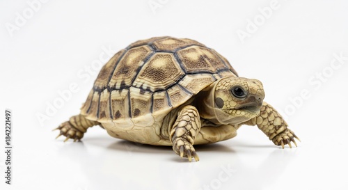 Fototapeta premium Tiny adorable tortoise hatchling slowly walking its patterned shell beautifully illuminated by soft studio light. AI Generated