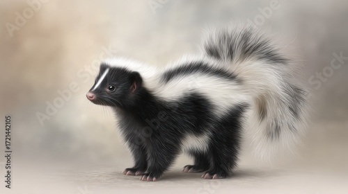 © สมเจตน์ หนูแก้ว, Fototapeta premium Tiny black and white skunk exploring a serene natural habitat realistic detail whimsical environment close-up perspective