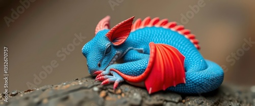 © Sanook, Naklejka premium Tiny blue-scaled dragon with vibrant red wings, curled up asleep, drawing, sleep