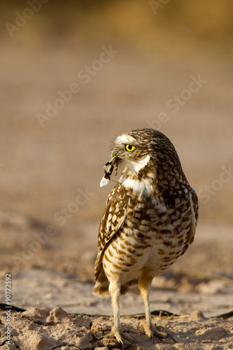 Fototapeta premium Tiny Burrowing Owl has caught a grasshopper in southern California