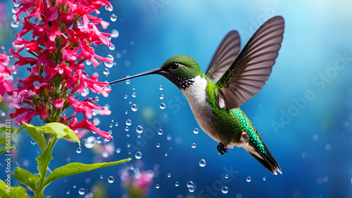 Fototapeta premium Tiny, colorful bird near flowers, drinking raindrops
