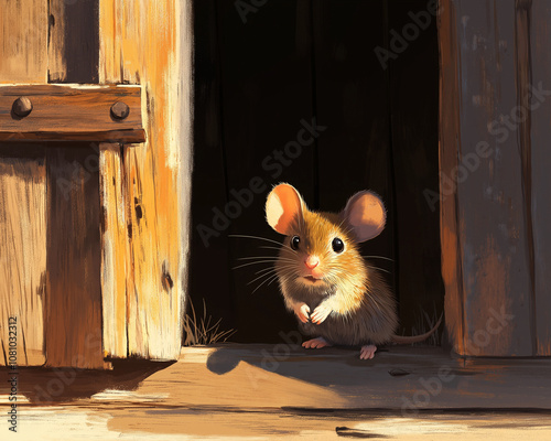 © Sekai, Obraz premium Tiny Curious Mouse Sneaking in Old Wooden Barn, Cute and Sneaky Wildlife Scene