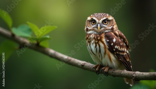 Naklejka premium Tiny Eurasian pygmy owl perched on slender branch, sharp gaze , cute, twig