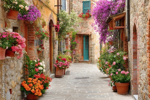 Naklejka premium tiny European alley filled with colorful flowers