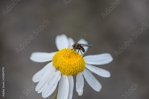 Fototapeta premium Tiny fly on a white and yellow flower close up