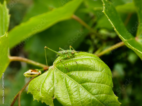 © Boris, Obraz premium Tiny Green Grasshopper Resting on a Textured Leaf in Nature