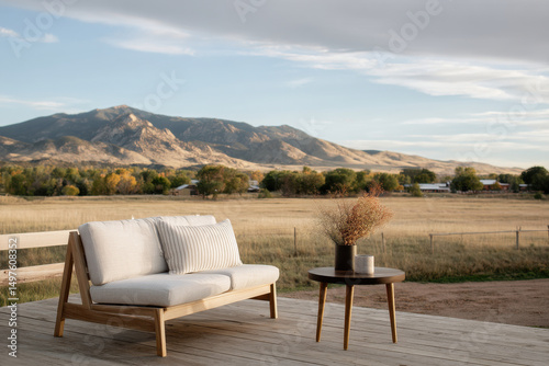 © Gordana, Fototapeta premium tiny house glamping terrace overlooking majestic mountains featuring cozy furniture and serene atmosphere