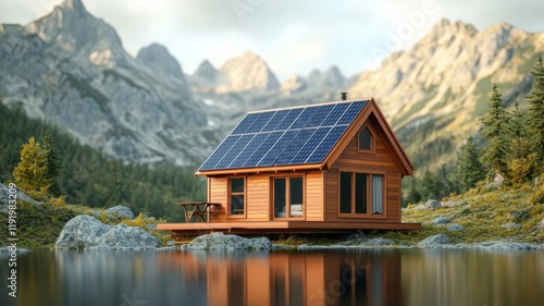 Fototapeta premium Tiny house, sustainable materials and solar panels, off-grid setting, 3D illustration