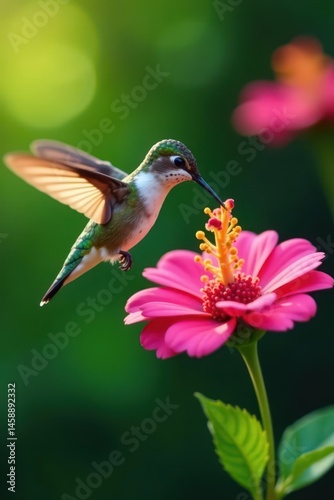 Naklejka premium Tiny hummingbird feeding, blurred motion, vibrant flower , image, small