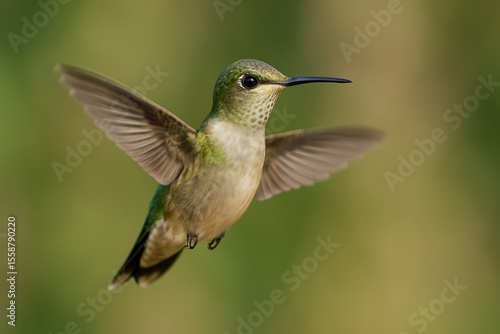 Obraz premium Tiny hummingbird flying in natural habitat. Wild bird hovering with spread wings. Delicate creature in motion, representing agility and freedom.