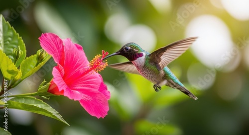 © MST, Naklejka premium Tiny hummingbird hovering near a bright pink hibiscus flower drinking nectar