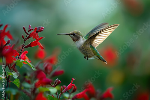 © SSG PHOTO, Fototapeta premium Tiny hummingbird hovering near red flower