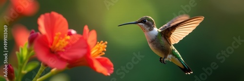Fototapeta premium Tiny hummingbird hovers, long beak in vibrant red bloom , closeup photography, nature