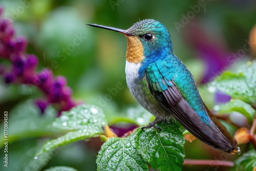 © YouraPechkin, Fototapeta premium Tiny Hummingbird Perched on Wet Leaf in Rain