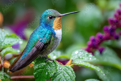 © YouraPechkin, Fototapeta premium Tiny Hummingbird Perched on Wet Leaf in Rain