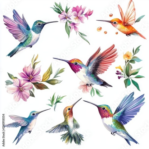 © Sirirat, Obraz premium Tiny hummingbird with a little nectar droplet collection, Watercolor style, isolated on white background, clipart