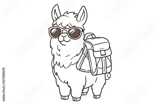 Fototapeta premium Tiny llama wearing sunglasses and a poncho, carrying a backpack.
