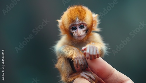 © Creative_Bringer, Obraz premium Tiny monkey perched on a finger, adorable and curious