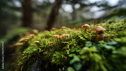 © zhikun sun, Obraz premium Tiny Mushrooms on Moss in a Misty Forest