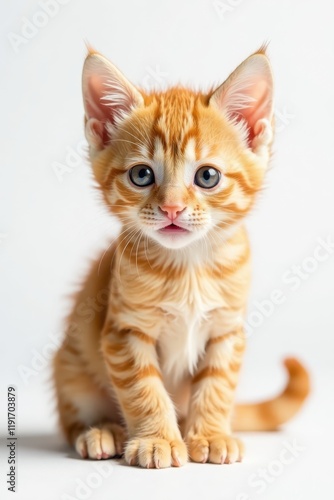 © dadtophoto, Fototapeta premium Tiny orange tabby kitten, alert pose, pure white backdrop, white, isolated