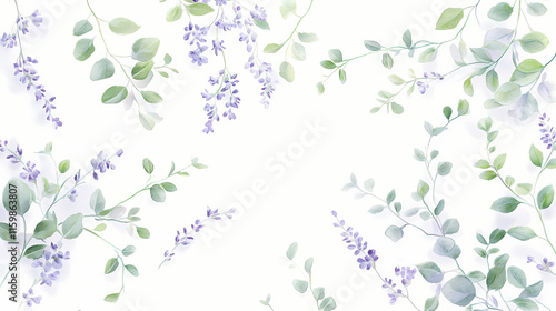 © Thiago, Fototapeta premium Tiny pastel lavender and seafoam green spring leaves with tiny lilac buds on a white backdrop. minimalistic, high resolution, clear sharp focus, hyper-detailed. Seafoam. Illustration