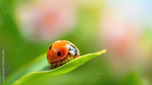 Obraz premium Tiny Red Ladybug Crawling on a Bright Green Leaf in Sunlight