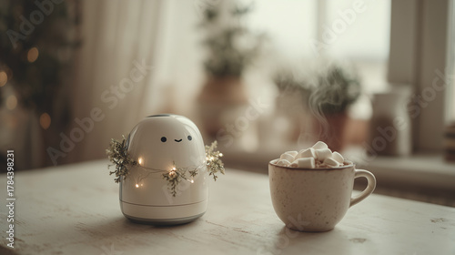 © Habrolabr, Obraz premium Tiny robot with Christmas lights by cocoa mug